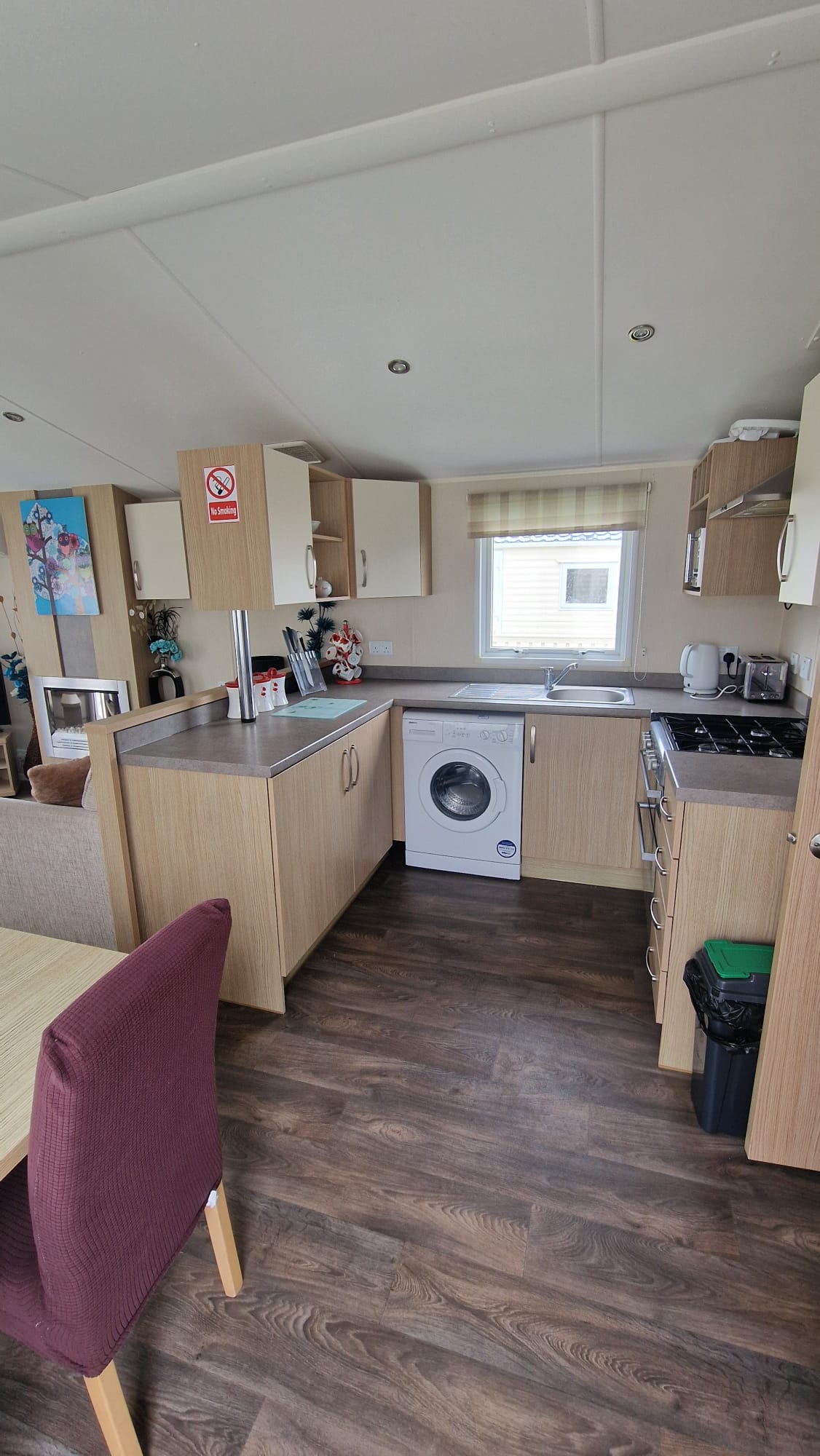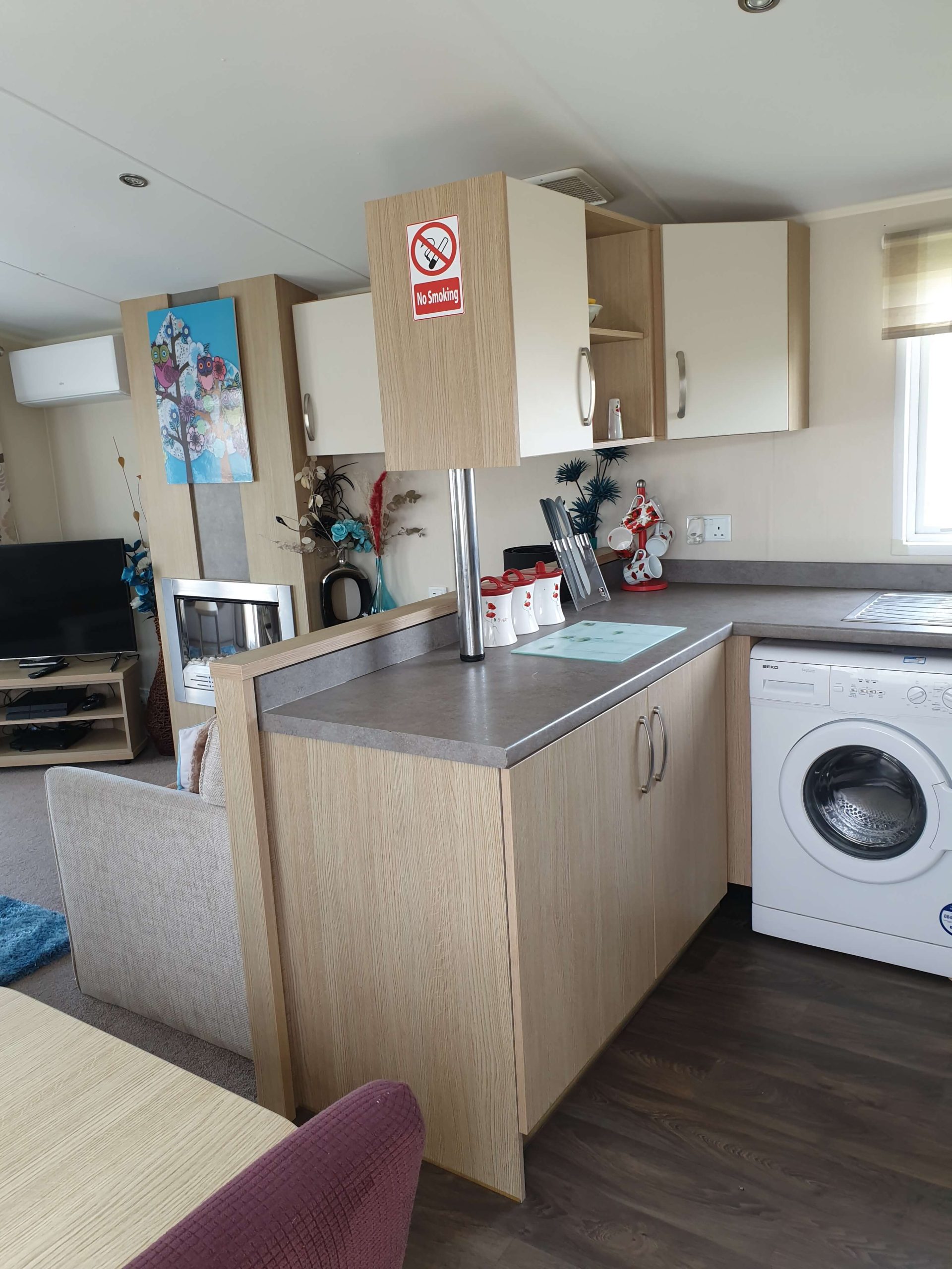 The kitchen boasts a large integrated fridge-freezer and an attractive overhead peninsular display unit. Free standing washing machine also in this van